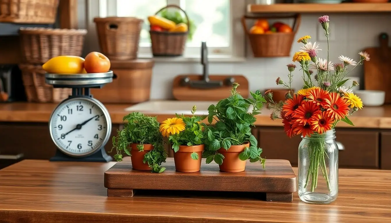 Farmhouse aesthetics emphasize simplicity and comfort. Vintage scale decor pieces can display fruits or vegetables for a charming focal point. Woven baskets provide ample storage and add a homey touch. Fresh flowers in mason jars create a vibrant contrast against wooden countertops. Rustic signs with kitchen-related quotes enhance personal expression while showcasing personality. Mixing these elements fosters a warm, inviting atmosphere ideal for gatherings.