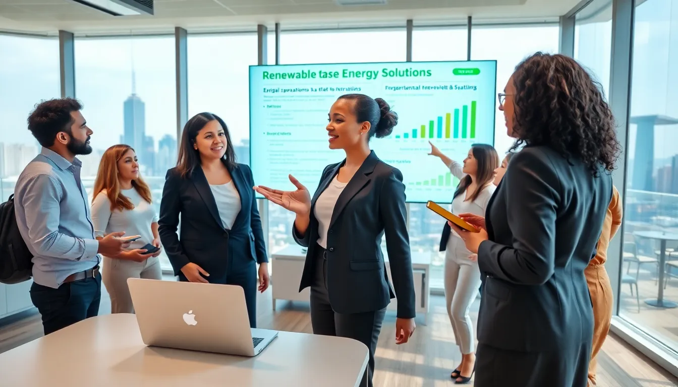 diverse team discussing sustainable energy solutions in a modern office.
